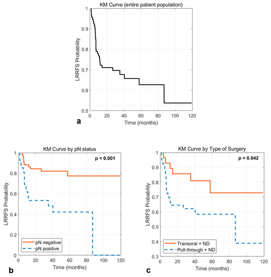The KM curve of the entire patient population and the KM curves obtained by categorizing the patients based on pN status and type of surgery are illustrated in Figure 5. The 5-year LRRFS probability for all patients was 62.7%; the 5-year LRRFS probability for patients with a negative and positive pN status was 77.4% and 42.1%, respectively (p < 0.001); the 5-year LRRFS probability for patients receiving transoral surgery plus neck dissection was 72.9% compared to 58.4% for patients receiving a pull-through surgery plus neck dissection (p = 0.042).