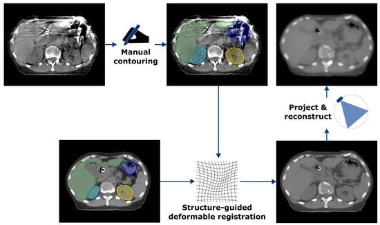 Synthetic CBCT generation process. Contours of the stomach (blue), liver (green), and both kidneys (cyan, yellow) manually drawn on daily CBCTs are used to drive a structure-guided deformable image registration from the planning CT with clinical contours to the daily CBCT. Analytical projections are then acquired of the deformed CT and reconstructed to produce the synthetic CBCT data.
