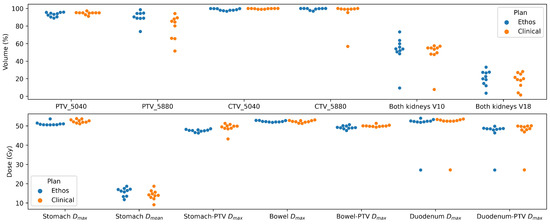 Figure 3 presents dose metrics computed across 70 simulated fractions using the native AI-based Ethos adaptive workflow. In each case, a line of equality is plotted between the value achieved in the scheduled plan that was rigidly aligned to the daily image and the adapted plan that was reoptimized based on the new contours. For the low- and high-dose targets (Figure 3a,b), all points but one (CTV_5880 in Figure 3b) lie to the left of this line, indicating that plan adaptation yielded nearly uniform improvements in target coverage compared to the corresponding scheduled plans. Ultimately, low-dose PTV and CTV dose coverage goals were satisfied in 77% and 86% of adapted plans, respectively, improving from 0% and 1% of scheduled plans (unrealistic contours produced in this workflow introduce a bias in the scheduled cases). Similarly, coverage goals of the high-dose PTV and CTV were satisfied in 70% and 89% of adapted plans, compared to 0% and 16% of scheduled plans. Average improvements in target coverage between the scheduled and adapted plans are presented in Table 2. The comparison of OAR dose metrics is less uniform in terms of position relative to the line of equality, but general improvements in OAR sparing are observed with plan adaptation using the auto-contouring workflow (Figure 3c–f). Various constraints on the bowel and stomach were the most frequently violated in the scheduled plans as illustrated in Table 1 and Figure 3c,d. The average changes in OAR sparing between scheduled plans and adapted plans are summarized in Table 2. In sum, 55 adapted fractions satisfied all OAR dose constraints compared to just 5 scheduled fractions.