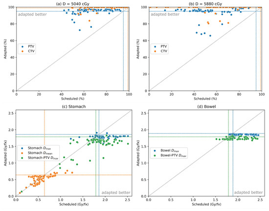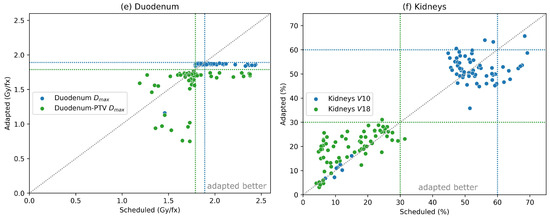 Comparison for the deformation-based workflow between dose metrics in scheduled and adapted plans over 70 simulated fractions for the low-dose targets (a), high-dose targets (b), stomach (c), bowel (d), duodenum (e), and kidneys (f). Coverage goals and dose limits from Table 1 are illustrated in each case as dotted lines of the corresponding color along with the line of equality between scheduled and adapted plans.