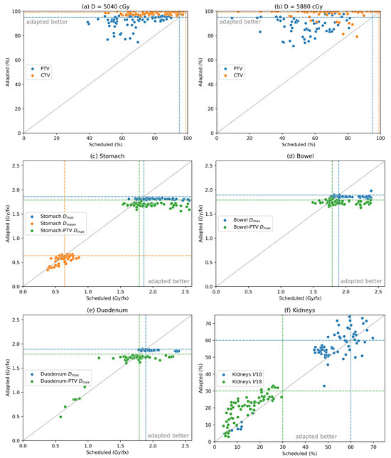 Comparison for the auto-contouring workflow between dose metrics in scheduled and adapted plans over 70 simulated fractions for the low-dose targets (a), high-dose targets (b), stomach (c), bowel (d), duodenum (e), and kidneys (f). Coverage goals and dose limits from Table 1 are illustrated in each case as dotted lines of the corresponding color along with the line of equality between scheduled and adapted plans.