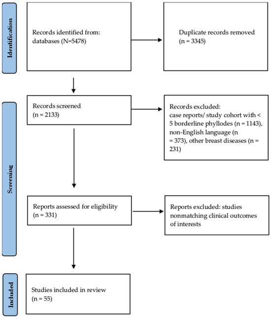 We conducted a literature review of studies published between 1995 and 2024. Our search utilized Medline, PubMed, Scopus, the Cochrane Library, and Web of Science databases. The primary Medical Subject Heading (MeSH) search terms included “breast”, “phyllode”, “phyllodes”, “borderline”, “recurrence”, and “relapse”. Reference lists of the identified articles were searched for other potentially relevant articles. We excluded non-English language papers, case reports, and studies with fewer than five patients. Being a narrative review, for greater completeness, we have also reported the results of other systematic reviews. All articles’ titles and abstracts reporting outcomes of phyllodes borderline tumors were individually screened and reviewed by two authors (FB, NG). If there was disagreement on inclusion, a consensus was obtained after discussion. The results of the literature search and study selection process are summarized in the flow diagram (Figure 1).