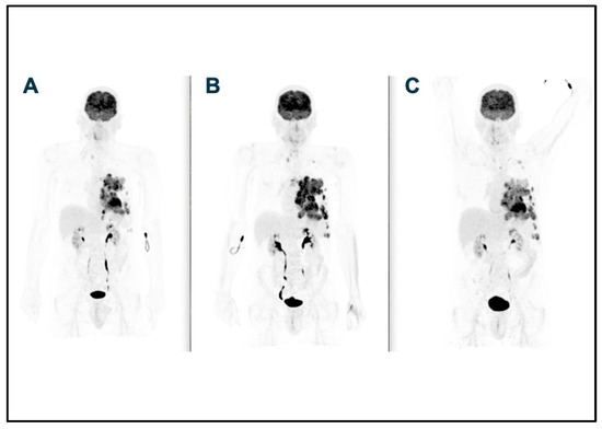 WB images of baseline 18F-FDG PET scan (A), 18F-FDG PET scan after first 4 cycles of immunotherapy (B), and subsequent 18F-FDG PET scan (C).