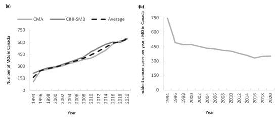 Cancer is the leading cause of death in Canada, accounting for 27% of all national deaths at the time of the last national census in 2023 []. Additionally, cancer rates have risen annually in Canada, with 239,100 cases projected for the year 2023 []. The rising burden of cancer within Canada is of interest to health system decision makers. Global projections predict a rise in both the incidence of cancer as well as the demand for systemic therapy in upcoming years [,]. Medical oncologists are physicians who manage the care of cancer patients and oversee the delivery of systemic therapy and, as a whole, they can be described as the MO workforce. Supply and demand projections from America, Europe, Australia, and Spain suggest that the demand for oncologic services may outstrip the supply if adequate workforce growth is not maintained [,,,]. Thus, from a policy perspective, it is vital that trends in the MO workforce within Canada are summarized such that prior policy can be evaluated and future policy directed in order to ensure an adequate supply of MOs to service the country’s cancer system.