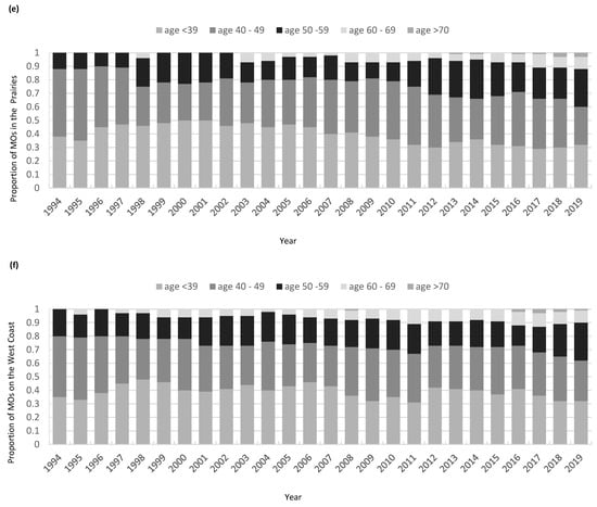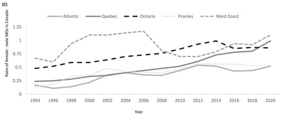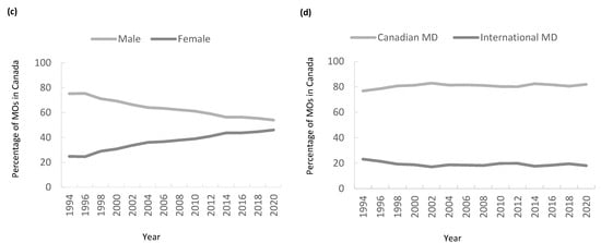 According to CIHI-SMDB for the year 2020, Atlantic Canada has the lowest proportion of female MO (34%), followed by the Prairie Provinces (35%), Ontario (46%), Quebec (50%), and the West Coast (52%) (Figure 3c). The proportion of female MO providers increased in all regions between 1994 and 2020.