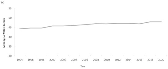 Information on practicing MO was obtained from both the Canadian Medical Association—Physician Data Centre (CMA-PDC; 1994–2019) [] and the Canadian Institute for Health information—Scott’s Medical Database (CIHI-SMDB; 1994–2020) []. Details of each database used are shown in Table 1. Data from each database were manually extracted by one reviewer (AF). MO workforce data were extracted for the years 1994–2020 because these years included the greatest overlap between the CIHI-SMDB database (1968–2020) and the CMA-PDC database (1994–2019). Each database reports similar demographic data including the number of MO practicing in each province, as well as their gender and age. For categories where both databases contained identical information such as the number of MO, the data were averaged. The age distribution of MO was categorized using different cutoffs in the CIHI-SMDB versus CMA-PDC databases; thus, data could not be aggregated and were instead reported separately for each database.