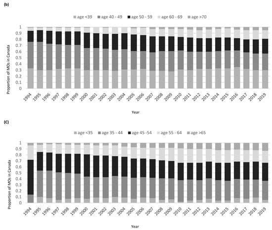 (a) Average age of Canadian MO workforce by year; (b) proportion of MO in each age category over time (CIHI); (c) proportion of MO in each age category over time (CMA).