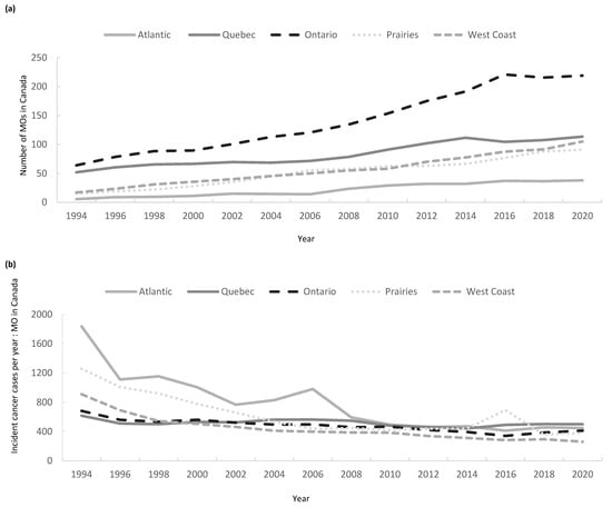The number of MO increased across all regions of Canada over the study period (Figure 3a). The largest proportional increase was seen in the Atlantic provinces, with 6 MO in 1994 compared to 38 in 2020 (+533%), followed by the West Coast (17 to 105:+518%), Prairie Provinces (15 to 91:+507%), Ontario (64 to 219:+242%), and Quebec (59 to 189:+220%).