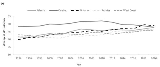 Regional variation in the age composition of oncologists according to CIHI-SMB is shown in Figure 4 for all regions. In 1994, the average age of an MO was highest in Quebec (48 years) compared with the West Coast (43), Atlantic Canada (42), the Prairie Provinces (42), and Ontario (40), which had the lowest average age. In contrast, in 2020, the average age of MO was the highest in Ontario (49 years), followed by Atlantic Canada (49 years), Quebec (48 years), the Prairie Provinces (47 years), and the West Coast (46 years).