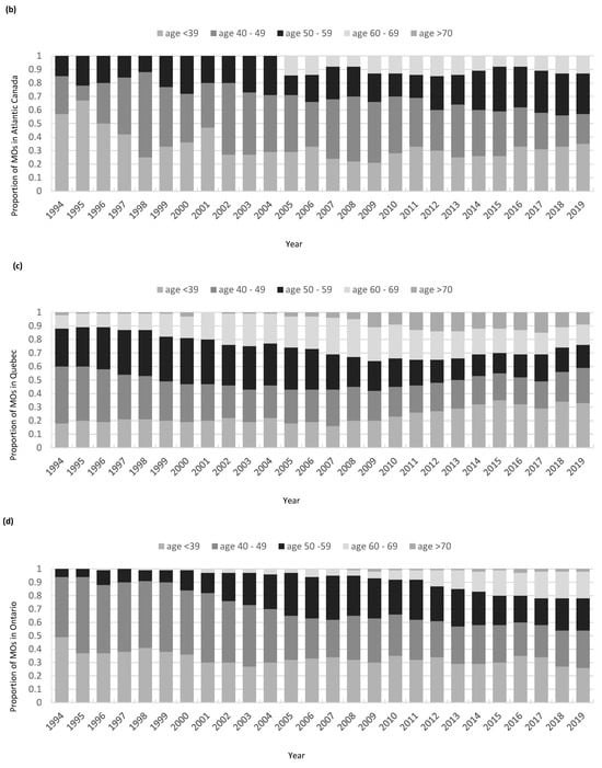 Aside from Quebec, there is a trend towards an older demographic, with a larger proportion of MO now in the age bracket >50 years of age across Canada. For example, in Ontario, 44% of MO are now >50 years old, with 14% now over the age of 65 years compared with 6% and none in 1994, respectively. As more MOs reach the typical retirement age of 65 [], increased turnover and replacements will be required to maintain stability in the workforce. In Quebec, the average age of MO rose rapidly in 1994 when many practicing hematologists recertified as medical oncologists, which, together with low trainee numbers, led to the Quebec MO population being older than the rest of Canada. More recently, the proportion of Quebec MOs < 50 years of age has started to rise (Figure 2), as the proportion of Canadian MO trainees from Quebec has risen from 2/26 (8%) in 1994 to 18/99 (18%) in 2019. These data support the assertion that workforce numbers can potentially be modulated through increases in the number of trainees in each region.