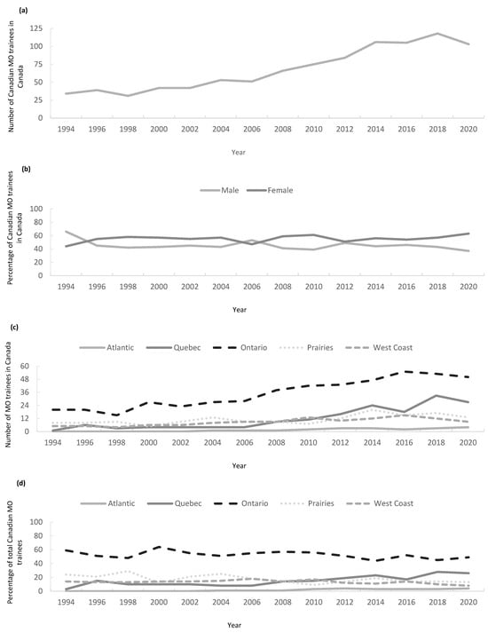 The number of MO trainees in Canada rose from 34 in the 1994–1995 academic year to 99 in the 2019–2020 academic year, representing a 191% increase (Figure 5a). These trainees were trained at nine universities in four provinces (British Columbia, Alberta, Ontario, and Quebec). With time, MO training programs emerged at the University of Manitoba (Manitoba) in 1993/94, University of Laval (Quebec) in 1995/96, Dalhousie University (Nova Scotia) in 2003/04, Queens University (Ontario) in 2006/07, University of Sherbrooke (Quebec) in 2010/11, and Memorial University (Newfoundland and Labrador) in 2015/16, increasing training capacity to 15 residency programs in seven provinces. No MO training programs exist in Saskatchewan, New Brunswick, Prince Edward Island, and the Canadian Territories.