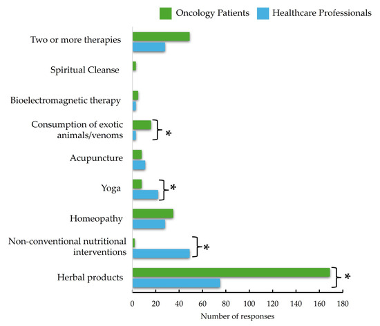 The frequent use of alternative medicine was significantly higher among oncology patients compared to healthcare professionals (46.3% vs. 19.1%, p < 0.001) (Table 5 and Figure 1). Specifically, the use of plants was notably more common among oncology patients (43.4%) than among healthcare professionals (15.8%) (p < 0.001). This pattern was also observed for homeopathy, with 9.2% of oncology patients reporting its use versus 3.3% of healthcare professionals (p = 0.036). Furthermore, the consumption of exotic animals and venoms was more prevalent among oncology patients (4.8%) than healthcare professionals (0.0%) (p = 0.004). Ayurveda, traditional Chinese medicine, zootherapy (therapeutic approach that involves interaction with animals), and osteopathy were not mentioned in any case, so it can be inferred that they are rarely used or not identified in the region.