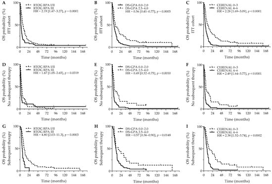 OS outcomes for brain metastasis prognostic scores. Y-axis depicts cumulative survival (%), X-axis depicts survival time in months. OS curves are shown for: (A) RTOG RPA in the ITT cohort (p = 0.0001), (B) DS-GPA in the ITT cohort (p = 0.0003), (C) CERENAL in the ITT cohort (p < 0.0001), (D) RTOG RPA in patients who did not receive subsequent systemic therapy (p = 0.0319), (E) DS-GPA in patients who did not receive subsequent systemic therapy (p = 0.0010), (F) CERENAL in patients who did not receive subsequent systemic therapy (p < 0.0001), (G) RTOG RPA in patients who received subsequent systemic therapy (p = 0.0003), (H) DS-GPA in patients who received subsequent systemic therapy (p = 0.0148), and (I) CERENAL in patients who received subsequent systemic therapy (p = 0.0002). HRs (95% CIs) are indicated in each survival graph. CI, confidence interval; DS-GPA, diagnosis-specific graded prognostic assessment; HR, hazard ratio; OS, overall survival; RTOG RPA, Radiation Therapy Oncology Group recursive partitioning analysis.