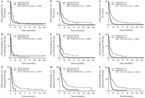Comparable survival outcomes were obtained for evaluation of DSS. As was seen for OS, RTOG RPA I/II (8.1 versus 2.9 months; p = 0.0005), DS-GPA 2.5–4.0 (9.4 versus 5.8 months; p = 0.0003), and CERENAL 0–3 (10.7 versus 4.5 months; p < 0.0001) showed a favorable DSS outcome (Figure 2A–C). For DSS, however, only CERENAL was considered an independent prognosticator on multivariate analysis. In the cohort of patients who did not receive subsequent systemic therapy, RTOG-RPA I/II was only borderline significant (4.5 months versus 2.3 months; p = 0.0589), whereas DS-GPA 2.5–4.0 (5.9 months versus 3.0 months; p = 0.0008) and CERENAL 0–3 (5.8 months versus 2.6 months; p < 0.0001) were associated with prolonged DSS (Figure 2D–F), with CERENAL being the independent prognosticator on multivariate analysis (p < 0.0001). In the cohort of patients who received any subsequent therapy, all brain prognostic scores—RTOG-RPA I/II (11.6 months versus 6.4 months; p = 0.0015), DS-GPA 2.5–4.0 (16.6 months versus 10.4 months; p = 0.0140) and CERENAL 0–3 (14.4 months versus 9.4 months; p = 0.0004)—proved significant on univariate analysis (Figure 2G–I), with again only CERENAL being withheld in the multivariate analysis (p = 0.0006). All data regarding DSS outcomes are given in Table 4 and Table S3.