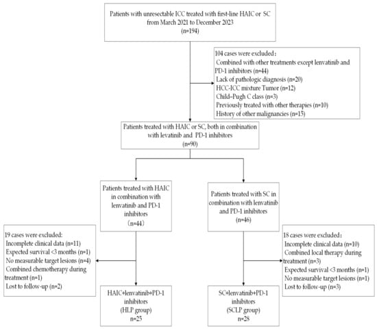 This retrospective study, carried out at the First Affiliated Hospital of Nanchang University from March 2021 to December 2023, involved 53 patients receiving either HLP or SCLP treatment as first-line therapy. Participants qualified for inclusion in this study provided they fulfilled the specific criteria outlined below: (1) they were initially diagnosed with ICC confirmed by both pathology and imaging, and their disease had been assessed as unresectable by two experienced hepatobiliary surgeons. Unresectable cases include tumors closely adjacent to major blood vessels, making R0 resection unachievable; those with vascular invasion, lymph node metastasis, or distant metastasis; and cases where the remaining liver volume after resection does not meet the criteria of the safe liver resection decision-making system; (2) they were aged between 18 and 78 years; (3) they had undergone at least one cycle of HAIC or SC treatment, both alongside lenvatinib and a type of PD-1 inhibitors; (4) they had an Eastern Cooperative Oncology Group (ECOG) performance status score of either 0 or 1; and (5) they presented with a minimum of evaluable target lesion detectable through imaging as defined by the Response Evaluation Criteria in Solid Tumors (RECIST) 1.1 criteria. The primary reasons for exclusion are listed below: (1) liver function evaluation criteria (Child–Pugh) class C; (2) history of other malignancies; (3) anticipated survival time of under 3 months; (4) incomplete clinical data; or (5) lost to follow-up.