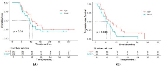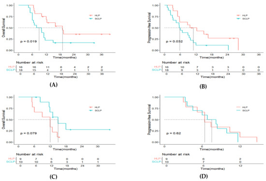 The follow-up duration medians were 12.3 months (range: 5.1–39.7) and 11.0 months (range: 4.3–34.6) for the two treatment groups, respectively. Up to the latest follow-up on 1 July 2024, disease progression occurred in 21 patients (84%) from the HLP group, with 17 (68%) deaths. In the SCLP group, 27 patients (96%) had tumor progression, and 21 (75%) had passed away. The median OS for the HLP group was 12.8 months (95% CI: 8.7–16.9), compared to 11.0 months (95% CI: 8.5–13.5) for the SCLP group (p = 0.310, Figure 2A). For PFS, the HLP group showed a median of 8.8 months (95% CI: 3.4–14.2), notably exceeding the 6.4 months (95% CI: 4.4–7.6) observed for the SCLP group (p = 0.043, Figure 2B). By analyzing patients without extrahepatic metastasis as a separate subgroup, we found that those in the HLP group showed significantly superior results in not only OS (p = 0.019, Figure 3A) but also PFS (p = 0.032, Figure 3B). However, for patients with extrahepatic metastases, the OS (p = 0.079, Figure 3C) and PFS (p = 0.620, Figure 3D) in the HLP group showed no significant differences compared to those in the SCLP group.
