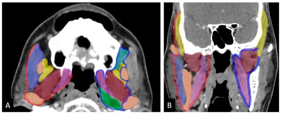 Axial (A) and coronal (B) images show masticator space on the right bounded by fascia (red) and infratemporal fossa bordered by an imaginary line (blue). Color code for muscles: purple: masseter; yellow: temporalis; brown: lateral pterygoid; pink: medial pterygoid; green: prestyloid parapharyangeal space; light green: retroantral space (adapted from Mahajan et al. ref []).