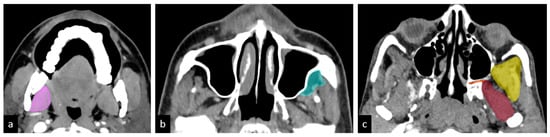 Hypothesized sub-compartments of the ITF: (a) compartment 1: low ITF—medial pterygoid (pink); (b) compartment 2: anterior high ITF—retroantral fat (light green); (c) compartment 3: posterior high ITF; compartment 3a: paramandibular compartment—paramandibular fat/temporalis (yellow); compartment 3b: muscle compartment—lateral pterygoid (brown); compartment 3c: perineural compartment—pterygopalatine fossa and pterygomaxillary fissure (orange) [].
