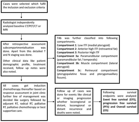 Background: According to the 8th edition of the American Joint Committee on Cancer (AJCC), involvement of the masticator space and infratemporal fossa (ITF) in oral cancers indicates advanced disease (T4b), which is often considered unresectable. Previous studies have shown that the extent of ITF involvement influences management and outcomes. Therefore, to optimize management, T4b disease should be subclassified based on ITF involvement. Notably, infranotch disease has a more favorable prognosis compared to supranotch disease. Our study also observed that certain subsets of high anterior retroantral ITF involvement may be operable with favorable clinical outcomes. This study aims to derive a new image-based compartmentalization of high ITF involvement and assess its impact on the management and outcomes of oral head and neck squamous cell carcinoma (HNSCC) patients with high ITF involvement. Materials and Methods: This retrospective observational study included 154 non-metastatic, upfront unresectable locally advanced HNSCC patients who were fit for induction neoadjuvant chemotherapy (NACT). ITF involvement was classified into distinct compartments, and detailed staging of the primary tumor (T) and regional nodes (Ns) was performed. Clinical data, including patient demographics, treatment received, and follow-up notes, were documented. Prognosis was assessed using survival metrics: event-free survival (EFS), progression-free survival (PFS), and overall survival (OS). The ITF was categorized into the following compartments: compartment 1 (low ITF: medial pterygoid), compartment 2 (anterior high ITF: retroantral fat), compartment 3 (posterior high ITF), including 3a (paramandibular compartment: paramandibular fat/temporalis), 3b (muscle compartment: lateral pterygoid), and 3c (Perineural compartment: pterygopalatine fossa and pterygomaxillary fissure). Results: Of the 154 cases, 142 (92%) were classified as T4b, with 63 (40.9%) having high ITF involvement and 79 (55.6%) having low ITF involvement. Twelve cases had T4a disease, which was deemed unresectable due to extensive nodal involvement. Subcompartmentalization of the 63 high ITF cases revealed 26 (41.2%) with compartment 2 involvement, 17 (26.9%) with compartment 3a involvement, 11 (17.4%) with compartment 3b involvement, and 9 (14%) with compartment 3c involvement. Disease progression following NACT was significantly higher in compartment 3c, which showed a poor response (p = 0.007). Univariate analysis for PFS revealed similar outcomes for compartments 1 and 2 (p = 0.692), while compartment 3 demonstrated poorer outcomes (p = 0.033). Among thosehigh ITF involvement, compartment 3c had the worst PFS outcome (p = 0.03). Conclusions: Baseline imaging plays a critical role in guiding individualized treatment and predicting clinical outcomes. Low ITF involvement and disease limited to the high retroantral fat compartment exhibit similar clinical outcomes. Among the posterior high ITF compartments, involvement of the pterygopalatine fossa and pterygomaxillary fissure (compartment 3c) is associated with the worst prognosis and poor response to chemotherapy. Subcompartmentalization of ITF involvement provides valuable prognostic information to tailor treatment strategies.