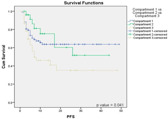 Survival function Kaplan–Meier curves correlating compartment 1 vs. compartment 2 vs. compartment 3 with PFS.