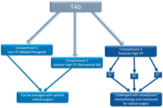 Advanced disease involving compartments 3a (temporalis muscle/paramandibular soft tissue), 3b (lateral pterygoid), and 3c (pterygopalatine fossa [PPF]/pterygomaxillary fissure [PMF]) can now be managed with neoadjuvant chemotherapy (NACT), potentially rendering these previously deemed inoperable cases resectable after tumor shrinkage. This evolving approach challenges prior assumptions that such cases were incurable. This hypothesis is supported by key trials, including TAX323 (Docetaxel + Cisplatin + 5-fluorouracil) and TAX324 (docetaxel, cisplatin, and 5FU vs. cisplatin and 5-fluorouracil), which demonstrated that induction chemotherapy is both safe and effective, enabling T4b patients to become candidates for resection [,,].
