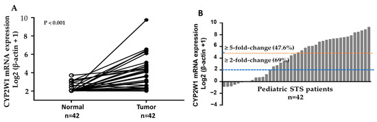 Relative CYP2W1 mRNA expression in pediatric STSs. (A) RT-qPCR analysis of relative CYP2W1 mRNA expression levels in 42 paired STS tumor tissues and adjacent normal tissues (p < 0.001). β-actin was used as the internal control for normalization. Tumor: STS tumor tissue. Normal: adjacent normal tissue. (B) Bar plot depicting CYP2W1 mRNA upregulation in tumor tissues compared to adjacent normal tissues. Upregulation was observed in 29 cases (≥2-fold, blue dashed line) and 20 cases (≥5-fold, red dashed line).