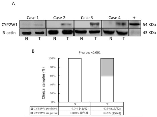 CYP2W1 protein expression in STS tumor tissues. (A) Representative Western blot results in STS tumor tissues (T) and adjacent normal tissue (N) across four clinical cases- β-actin was used as a loading control. The positive control is indicated (+). The uncropped blots are shown in the Supplemental Materials. (B) Frequency analysis of CYP2W1 protein expression in STS tumor tissues (T) and adjacent normal tissues (N). Aberrant CYP2W1 expression was detected in 40.5% (17/42) of STS tumor tissues, while no expression was observed in normal tissues (0/42). Statistical significance: p < 0.001. N: adjacent normal tissues; T: STS tumor tissues; CYP2W1: cytochrome P450 2W1.