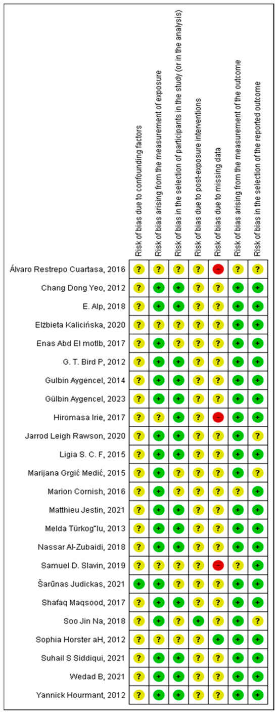 The investigators independently assessed the risk of bias using the Risk Of Bias In Non-randomized Studies of Exposures (ROBINS-E) scale []. The information was compiled and analyzed using the Review Manager tool (version 5.4.1) developed by the Cochrane Collaboration. The aspects assessed included random sequence generation, allocation concealment (selection bias), blinding of participants and personnel (conduct bias), blinding of outcome assessment (detection bias), loss to follow-up (attrition bias), and selective reporting (reporting bias), all corresponding to the criteria stipulated in the ROBINS-E scale.