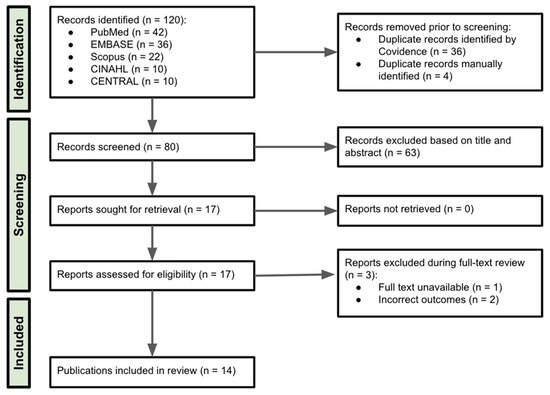 From the 80 articles identified through five databases (Figure 1), 63 were excluded during the title and abstract screening. Of the 17 full text articles reviewed, 3 were excluded due to incorrect outcome (n = 2) [33,34] or lack of full text (n = 1) [35] (Figure 1). Fourteen studies were included for final analysis (Table 1) [27,28,29,36,37,38,39,40,41,42,43,44,45,46]: seven cross-sectional studies [27,28,37,38,41,42,45], three cohort studies [36,39,40], two meta-analyses [29,46], one qualitative study [43], and one randomized controlled trial [44]. These studies were conducted across eight countries: the United States (n = 4) [27,36,37,42], United Kingdom (n = 2) [28,41], Australia (n = 1) [44], Canada (n = 1) [43], Germany (n = 1) [38], Japan (n = 1) [45], New Zealand (n = 1) [40], and Spain (n = 1) [39]. Two meta-analyses were conducted by UK-based institutions [29,46], with one involving Spanish collaboration [29]. The studies were published between 2012 and 2024.