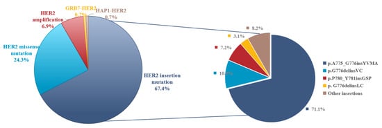 - Fang, W.; Zhao, S.; Liang, Y.; Yang, Y.; Yang, L.; Dong, X.; Zhang, L.; Tang, Y.; Wang, S.; Yang, Y.; et al. Mutation Variants and Co-Mutations as Genomic Modifiers of Response to Afatinib in HER2-Mutant Lung Adenocarcinoma. Oncologist 2020, 25, e545–e554. [Google Scholar] [CrossRef] [PubMed]