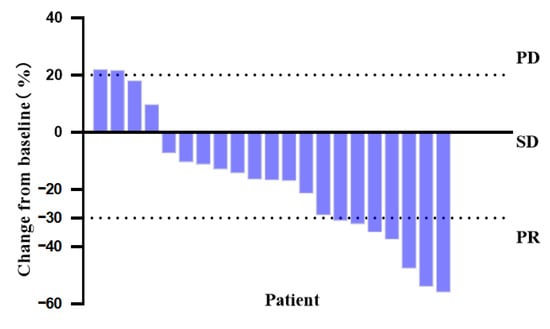 It is noteworthy that HER2-TKIs show varying efficacy profiles. For example, the efficacy of pan-HER2 TKIs such as Afatinib is not significant, with an ORR ranging from 0% to 20%, and the mPFS being from 2.8 to 3.7 months [,]. In the ZENITH20-2 cohort, the mPFS for poziotinib was reported to be only 5.5 months []. Beamion LUNG-1 is an ongoing, first-in-human, open-label study evaluating the safety and efficacy of zongertinib (a selective covalent HER2 TKI) [] in HER2-mutant NSCLC patients (Stage IB). According to the latest results from ESMO 2024 [], zongertinib showed an ORR of 44%, a DCR of 93%, and a 6-month PFS rate of 69%. Its efficacy outperforms traditional non-selective TKIs (such as afatinib), likely due to zongertinib’s higher selectivity and potent inhibition of HER2 exon 20 insertion mutations. Although our pyrotinib combined with chemotherapy regimen showed an ORR of 33.3%, its overall efficacy still holds certain competitive advantages, particularly in terms of DCR (95.2%) and mPFS (11.3 months). The combination treatment regimen may overcome the resistance issues associated with single-agent targeted therapy through synergistic effects, thereby providing sustained disease control. Although these cross-trial comparisons are influenced by heterogeneity in study design, our data suggest that pyrotinib combined with chemotherapy could be a clinically meaningful option for treating HER2-mutant NSCLC. Future randomized trials are needed for prospective validation to confirm the optimal first-line treatment for advanced HER2-mutant NSCLC patients.