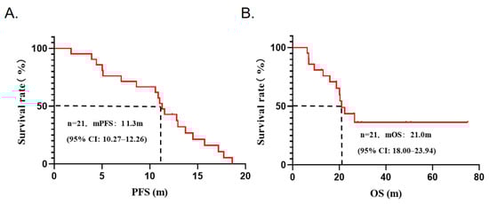Survival curves of 21 patients treated with pyrotinib combined with chemotherapy. (A): PFS; (B): OS.