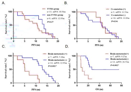 Kaplan–Meier survival curves showing PFS and OS in different groups. (A) Mutation subtypes and PFS: No significant difference between YVMA and non-YVMA groups (p = 0.37). (B) Co-mutation and PFS: No significant difference between positive and negative groups (p = 0.94). (C) Brain metastasis and PFS: Significantly lower in patients with brain metastasis (p = 0.001). (D) Brain metastasis and OS: Significantly lower in patients with brain metastasis (p = 0.002). (* indicates a statistically significant difference in p-value.)
