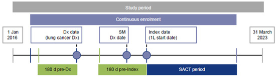 Eligible patients had a diagnosis of lung cancer (date of first diagnosis = Dx date) during the study period (1 January 2016 to 31 March 2023), a diagnosis of metastases on or after the Dx date (secondary malignancy date) and had received 1L SACT for lung cancer following the secondary malignancy date. The initiation of 1L SACT was determined as the index date. The study design is shown in Figure 1. The International Classification of Diseases, 10th Edition, Clinical Modification (ICD-10-CM) code C34 was used for identification of lung cancer diagnosis.