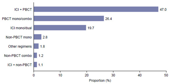 The most frequent 1L treatment regimens were ICI + PBCT (n = 7359; 47.0%), PBCT mono/combo (n = 4139; 26.4%) and ICI mono/dual (n = 3089; 19.7%) (Figure 2). Additional details on treatment patterns are provided in Supplementary Table S1.
