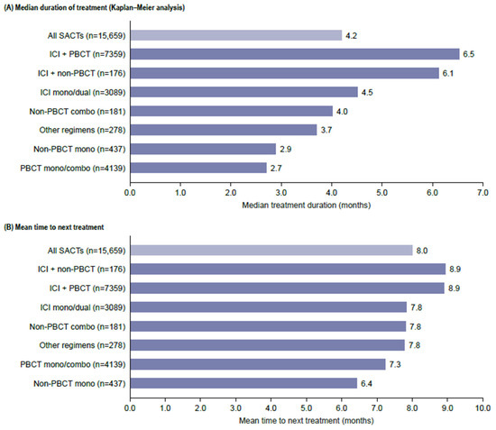 Duration of treatment and time to next treatment. ICI is an immune checkpoint inhibitor; PBCT is a platinum-based chemotherapy; SACTs, systemic anti-cancer treatment.