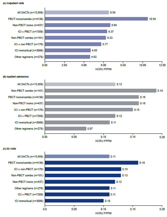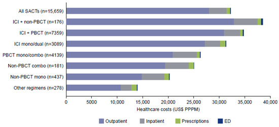 All-cause healthcare costs were largely incurred in outpatient settings ($28,045 [SD 37,735] PPPM), followed by inpatient costs ($3412 [SD 21,791] PPPM). Outpatient costs (PPPM) were highest for ICI in combination with chemotherapy: $32,913 (SD 50,790) for ICI + non-PBCT, followed by $30,888 (SD 37,409) for ICI + PBCT. Inpatient costs were highest for PBCT mono/combination therapy ($4725 [SD 22,874] PPPM), followed by ICI + non-PBCT ($4648 [SD 24,323] PPPM).