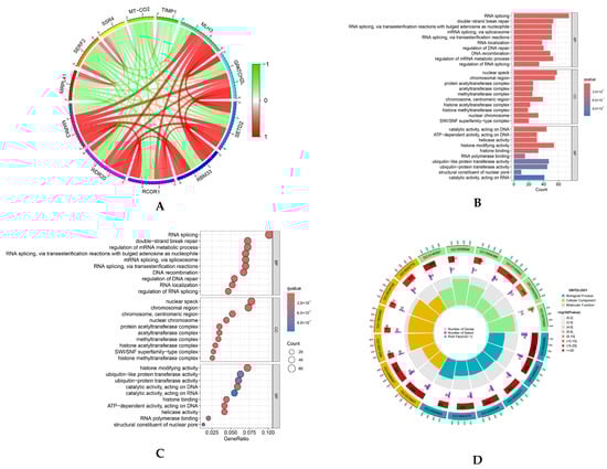 A circular diagram was created to illustrate the hierarchical links among the GO types. The outermost circle depicted the GO word IDs, categorized into three primary classifications: Molecular Function (MF), Biological Process (BP), and Cellular Component (CC). The second circle illustrated the quantity of genes enriched in each GO word, with colors denoting statistical significance. The third circle illustrated the quantity of overlapping genes associated with each GO term, whereas the innermost circle denoted the fraction of genes inside that category.