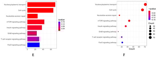 (A) Co-expression analysis of MARK3 with other genes in endometrial cancer. Positive correlations are represented by red, while negative correlations are represented by green, indicating the relationships between MARK3 and other genes in the context of endometrial cancer (Supplementary S1). (B–D) Gene Ontology (GO) enrichment analysis of MARK3 co-expressed genes. The enriched biological processes include cell division and microtubule organization, processes critical for cancer cell proliferation and metastasis. The respective p-values and q-values are shown (Supplementary S2). (E,F) GO and KEGG pathway enrichment analysis of MARK3 co-expressed genes. The analysis identifies key pathways, including cell cycle control and microtubule-based activities, which are essential for carcinogenesis. The associated p-values and q-values are presented.