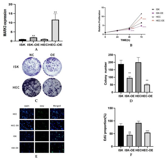 (A) The expression of MARK3 in different cell lines in mRNA levels via PCR. This experiment was repeated three times. Ishikawa ** p = 0.0027, HEC-1B ** p = 0.0048. (B) Analysis about CCK-8 Illustrating the Anti-Proliferative Effects of MARK3. The graph depicts the trends in viability, emphasizing the inhibitory impact of overexpressed MARK3 on cell proliferation in the HEC-1B and Ishikawa cell lines. This experiment was repeated three times. Ishikawa **** p < 0.0001, HEC-1B **** p < 0.0001. (C) The number of colonies formed by Ishikawa and HEC-1B cells overexpressing are significantly reduced compared to their respective non-overexpressing controls. (D) A comparative analysis chart from three repeats of colony formation between Ishikawa (** p = 0.0039) and HEC-1B (** p = 0.0014) cell lines reveals a marked decrease in colony count following overexpression, indicating a potential inhibitory effect on cellular proliferation. (E) Assay of Cell Proliferation and EdU Incorporation The cell proliferation in the control group, ISK-OE, and HEC-OE groups is illustrated, with merged pictures demonstrating diminished proliferative potential in the over expression groups relative to controls. Magnification: 200×. (F) The percentage of EdU-positive cells is markedly greater in the control group compared to the over expression groups, indicating a reduced proliferative response in those with over expression group. This experiment was repeated three times. Ishikawa ** p = 0.0038, HEC-1B *** p = 0.0009.(**, p < 0.01, ***, p < 0.001, ****, p < 0.0001).