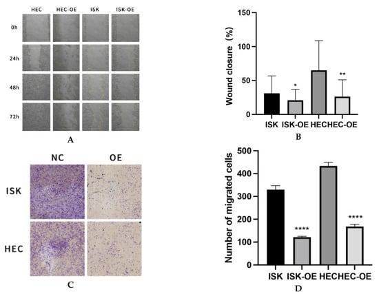 (A) Wound Healing Assay: The wound healing rate is significantly decreased in HEC-OE and ISK-OE cells relative to the control group. Magnification: 100×. (B) The quantification of wound closure reveals a significant decrease in the percentage of closure in HEC-OE and ISK-OE cells compared to the control group, signifying compromised migratory ability. This experiment was repeated three times. Ishikawa * p = 0.0237, HEC-1B ** p = 0.0040. (C) Illustrates the reduced migration of HEC-OE and ISK-OE in comparison to the control group in Transwell. Magnification: 200×. (D) Demonstrate that the migrating cell ratio is greater in the control group than in the HEC-OE and ISK-OE groups. This experiment was repeated three times. Ishikawa **** p < 0.0001, HEC-1B **** p < 0.0001.(*, p < 0.05, **, p < 0.01, ****, p < 0.0001).