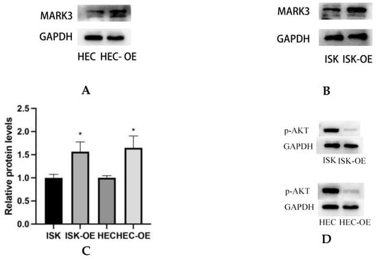 Western blot analysis was conducted to assess the impact of MARK3 overexpression on critical regulatory proteins in endometrial cancer cell lines, Ishikawa and HEC-1B. Figure 4A–C demonstrate that MARK3 expression was significantly increased in cells overexpressing MARK3 (HEC-OE and Ishikawa-OE) relative to control groups. Quantitative analysis indicated p-values of 0.0121 and 0.0124 for HEC-OE and Ishikawa-OE, respectively, thereby confirming the overexpression of MARK3.