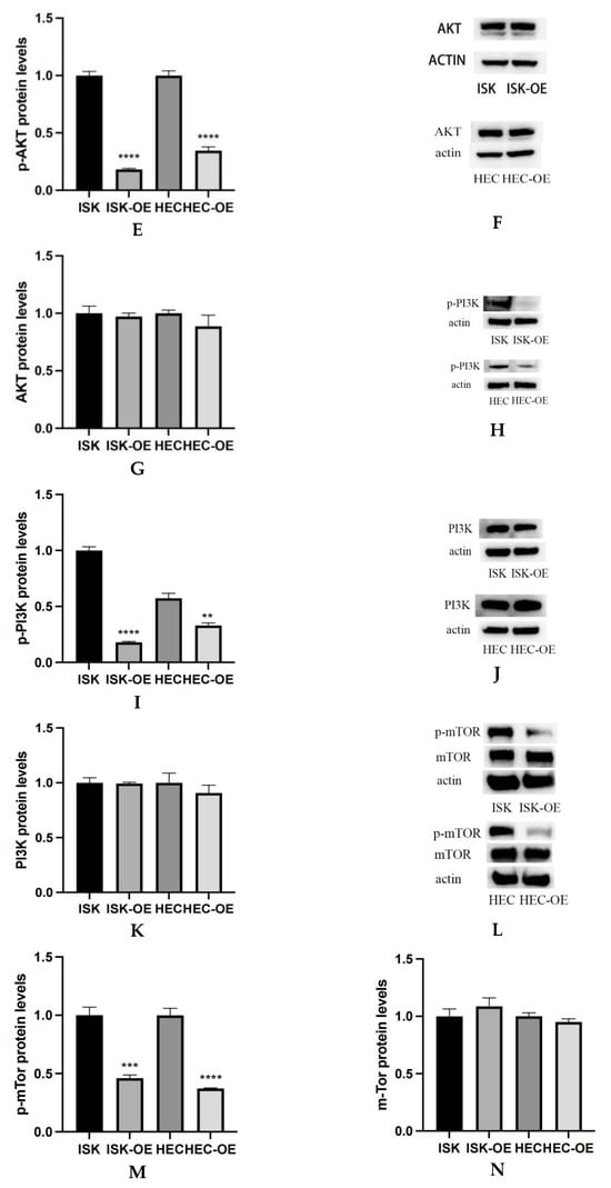The activation of cell proliferation and migration pathways was examined through the analysis of AKT, PI3K, and mTOR expression and its phosphorylated variant (p-AKT, p-PI3K, and p-mTOR). AKT is a crucial protein that plays a significant role in cell survival and proliferation, whereas p-AKT functions as a marker for pathway activation. Figure 4F,G indicate that total AKT expression did not exhibit a significant difference between overexpressing and control cells (HEC p = 0.1239, Ishikawa p = 0.5189). Analysis of p-AKT levels (Figure 4D,E) revealed a significant decrease in phosphorylated AKT in both HEC-OE and Ishikawa-OE cells (p < 0.0001); both p-PI3K and p-mTOR were significantly downregulated in the MARK3 overexpression groups(p < 0.05) (Figure 4H,I,L,M),while the levels of PI3K and mTOR remained largely unchanged (Figure 4J,K,L,N). This indicates that MARK3 overexpression may inhibit the activation of the PI3K/AKT/mTOR signaling pathway, which is associated with cell survival, tumor progression, and resistance to therapeutic interventions.