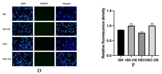 Immunofluorescence assays were performed to examine the subcellular localization of MARK3 in transfected cells. Figure 4O,P display the distribution of MARK3 within the cytoplasm and nucleus, with merged images indicating elevated expression in cells with overexpression. The statistical analysis indicated p-values of 0.0022 for Ishikawa cells and 0.0081 for HEC cells, confirming the overexpression of MARK3.