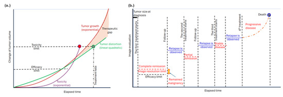 Tumor development. (a) There is a therapeutic gap due to tumors’ exponential growth. The toxicity limits the applicable dose. Here, the task of hyperthermia is to extend the limit with extra tumor distortion. (b) The available imaging observes complete remission and later relapses. The subsequent relapses happen due to the exceptional adaptation capability of the tumor cells, which remained in the location under the resolution of the actual imaging. The task of hyperthermia is to introduce new stress and suppress the possibility of adaptation.
