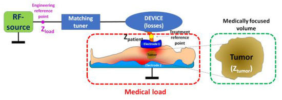 The electric circuit of modulated electro-hyperthermia. The specialized electronics regulate two reference points: the engineering control to ensure the optimal work and minimal loss of the RF source, having super-low reflected imaginary power, and the medical reference point to ensure the maximal energy focused on the selected target, the tumor. Proper material selection and careful design of specialized electronics minimize all losses.