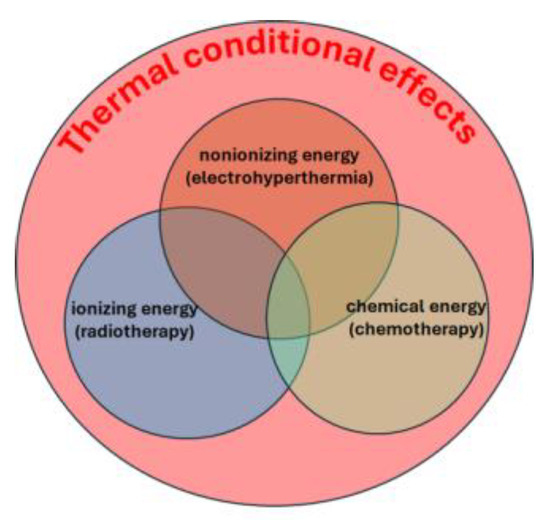 In contrast, mEHT departs from conventional heating methods by focusing its thermal effects on cancer cell membranes and ion channels [37]. It combines thermal and nonthermal impacts, similar to the synergy between conventional hyperthermia and ionizing radiotherapy. The thermal effects provide a general background for optimizing the nonthermal processes. The thermal background determines, in general, the chemical reaction rates according to Arrhenius law The chemical reactions caused by nonionizing (bioelectric fields), ionizing (radiotherapy), and chemical changes (chemotherapy) all change their rate and efficacy by the thermal conditions (Figure 3). This approach leverages the heterogeneity of tissue thermal and electrical properties to selectively target and eliminate malignancies [37].