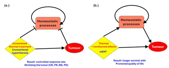 The difference between conventional hyperthermia and mEHT concerning natural homeostasis. (a) The effect of traditional hyperthermia. It works with thermal cell killing and has a reasonable remission rate. (b) mEHT works in harmony with homeostatic processes and elongates survival time with an increase in quality of life.