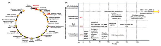 A significant process is that electromagnetic fields can nonthermally influence the activity of ion channels and transporters in cancer cells. Changes in ion channel function can alter the intracellular concentrations of ions such as calcium, sodium, and potassium. This affects various cellular processes, including signal transduction, enzyme activity, and cellular pH, which can indirectly modify the cell’s biochemical environment. The main deviation of mEHT from conventional heating techniques is that it helps and does not impede natural homeostatic actions. Constrained heating may destroy the tumor but can also cause a large attack on homeostatic regulation, which tries to compensate for the intensive local changes. So, homeostasis is loaded with two obstructions: cancer and aggressive heating (Figure 4a). The thermal and nonthermal synergy, which is optimized with a modulated RF signal in the mEHT method, helps the homeostatic regulation, induces immunogenic effects, and so extends the local effects to the whole body (Figure 4b).
