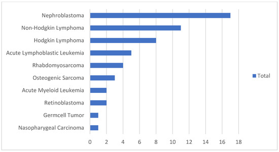Valid contact information was available for 60 families. Parents of 54 children were interviewed, either at the hospital (56%) or during home visits (44%). Respondents included mothers (46%), both parents (19%), fathers (11%), grandmothers (4%), or others (20%). Table 1 and Table 2 present the socio-demographic and clinical characteristics of the survivors and their parents. The median age at diagnosis was 5.0 years (IQR 3.0–8.0). A greater number of boys (67%) was represented. Most survivors (52%) had solid tumors (Figure 1).